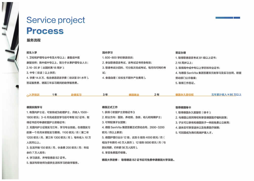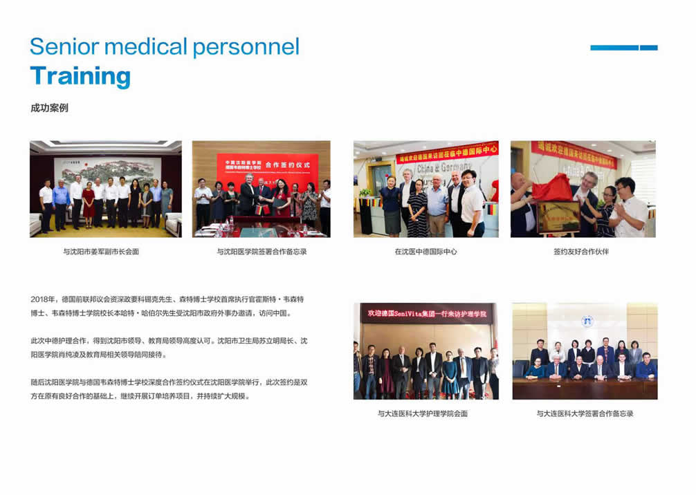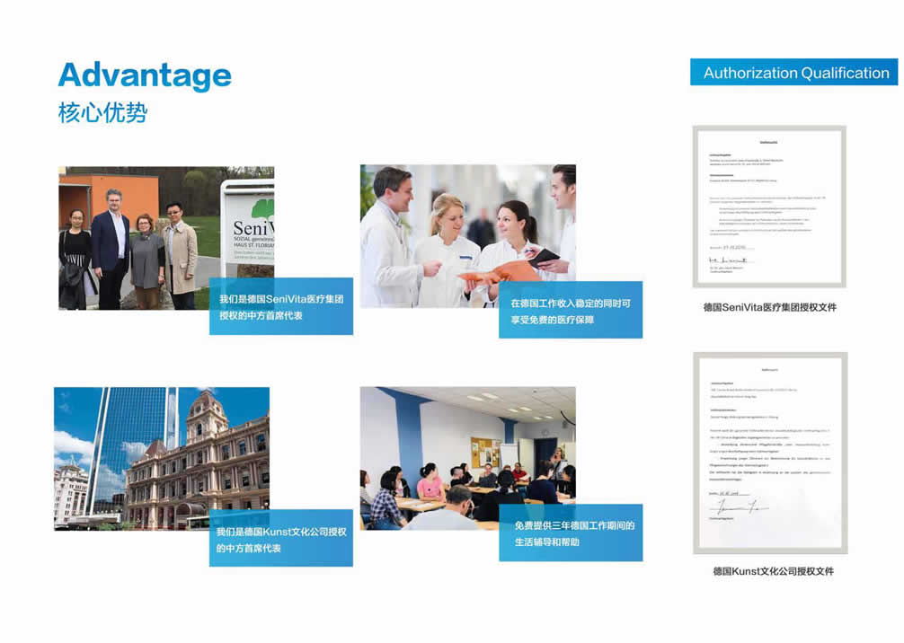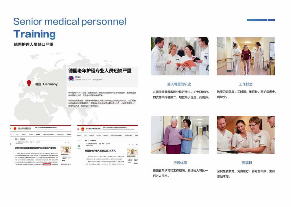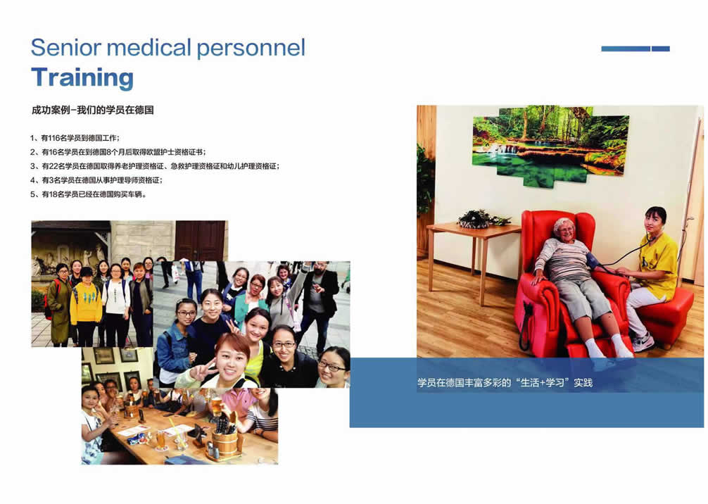 中德高级医护人才培养项目致力于帮助国内有意愿到德国发展或者有志在国内高端医疗/养老机构内从事管理等工作的人群提供一站式服务平台,为医疗护理专业技能人才搭建赴德国(欧洲)就业、深造及全家移民的桥梁!咨询电话: 张经理18600865994